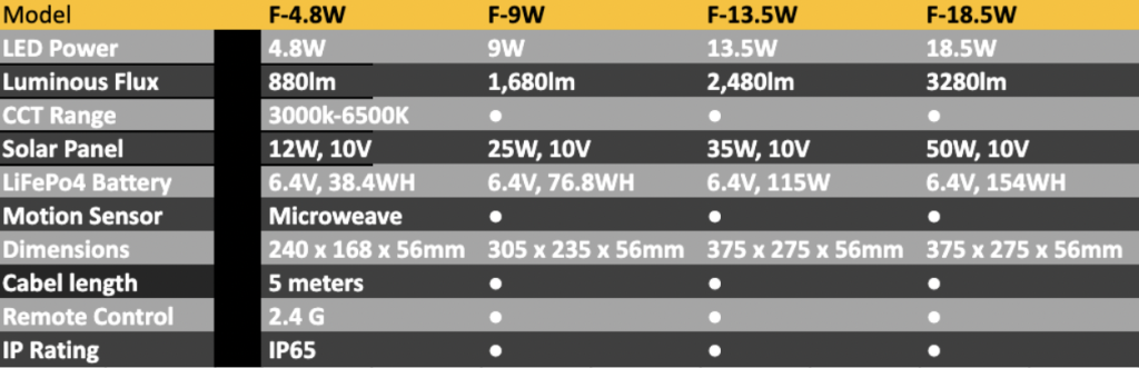 Solar LED FLood Light is crafted with attention to details from surface treatment, lumes to power control. Employing a Grade A LiFePo4 battery and a 2.4G remote control for easy power and duration performace setting.